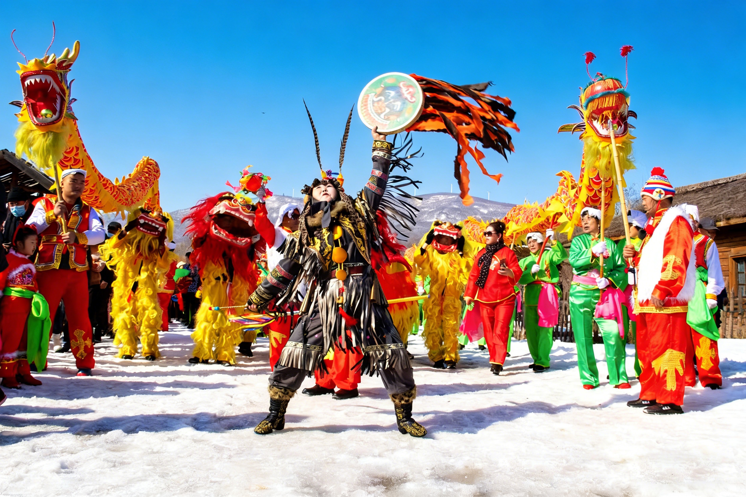 大寒之际,黑龙江省饶河县四排赫哲族乡锣鼓喧天,村民们身着彩衣,手持祥龙,在“伊玛堪”传承人的引领下蜿蜒巡游。龙身跃动,宛如破开凛冽寒流的一脉暖彩,鼓点敲碎冰封的寂静,把整座村庄裹进一片欢腾的热浪里。图为近日,饶河县赫哲族乡村民在村中舞龙巡游,以传统方式迎接一年中最寒冷时节的到来。(黑龙江省饶河县纪委监委供 王雪洋 摄)