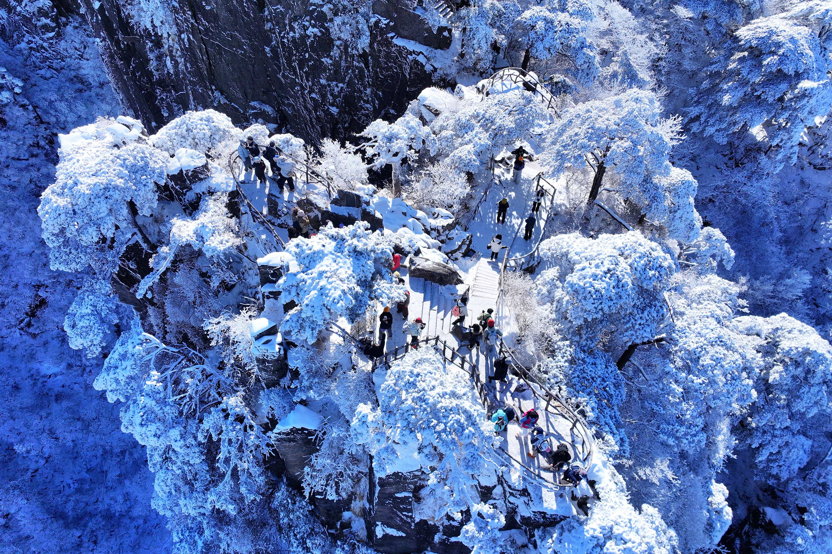 岁末隆冬,大雪天寒,安徽黄山层峦叠嶂尽覆银雪,朔风裹挟寒意呼啸而来,将岁末冬深之美雕琢得淋漓尽致。(安徽省黄山市屯溪区纪委监委供 樊成柱 摄)