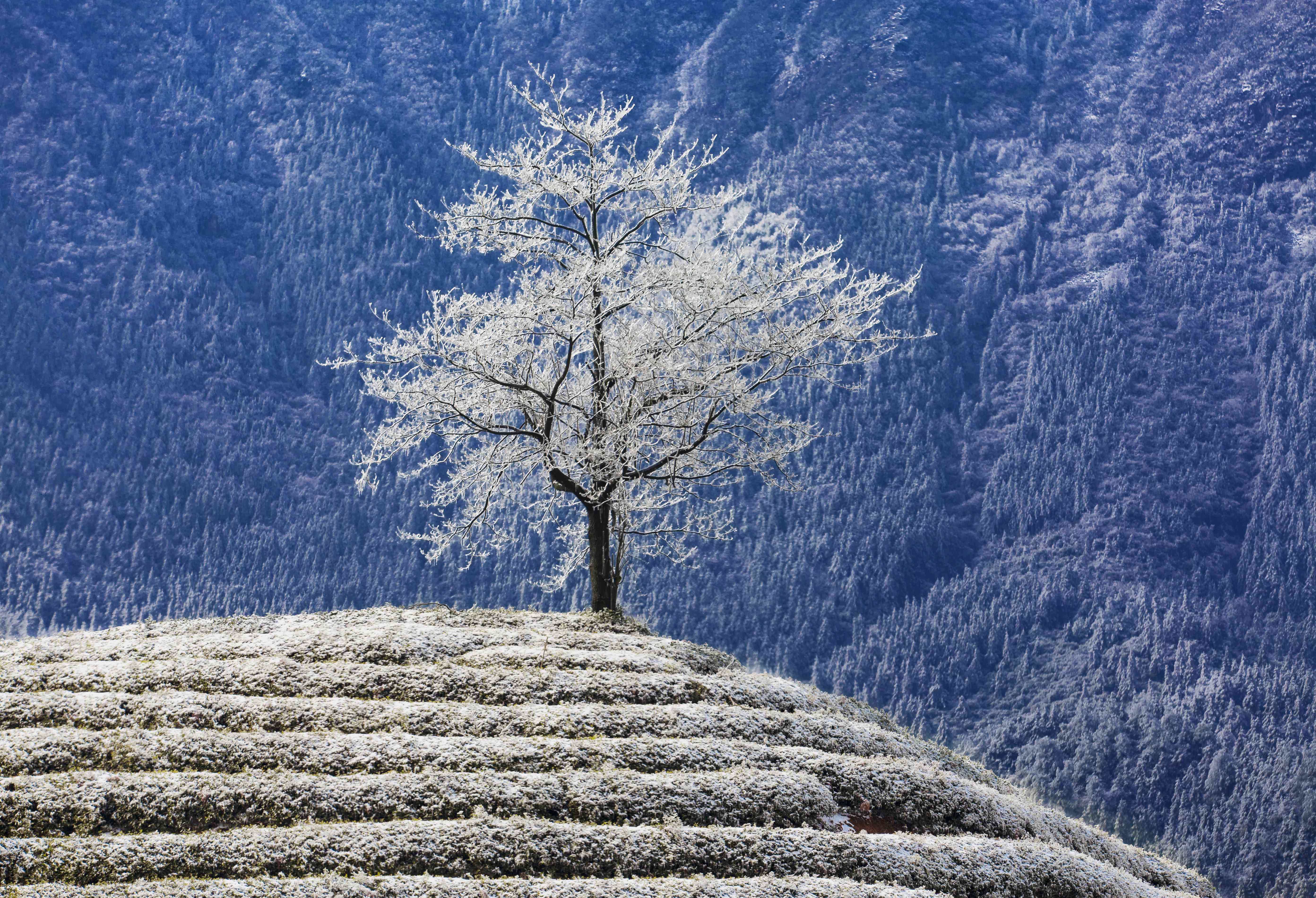 一场初雪,为浙江省金华市婺城区的北山披上了雪衣,山顶老树也挂满了冰晶,雪铸风骨,傲然挺立。(浙江省金华市婺城区纪委监委供 傅卫明 摄)