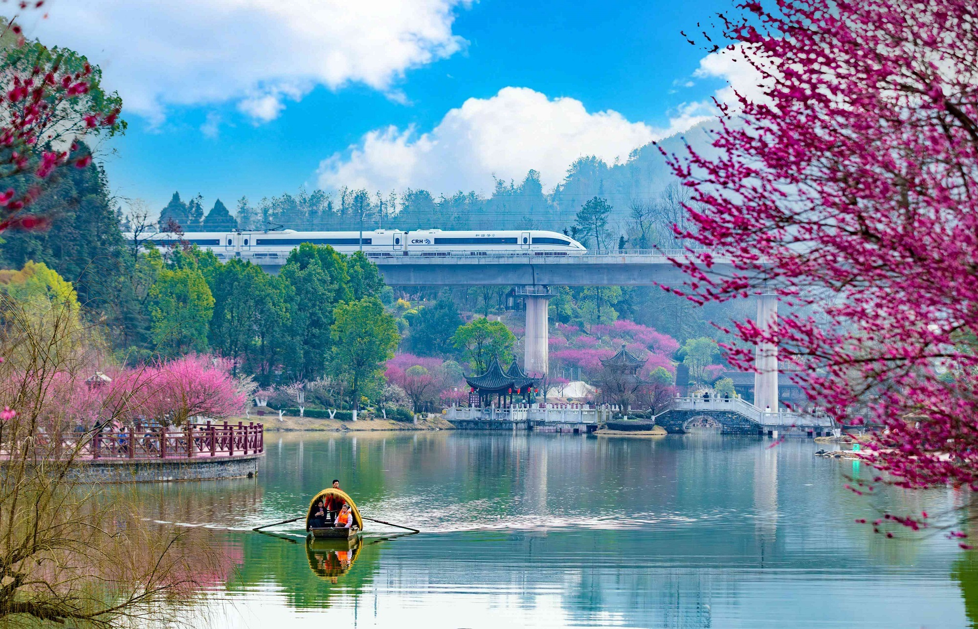 在重庆南川梅华园,古建亭台与盛放的梅花相映成趣,湖面乌篷载着游人踏春,远处高铁穿梭于青山花海之间,传统与现代碰撞,奏响了一首动人的春日交响曲。(重庆市南川区纪委监委供 梁雪浪 摄)