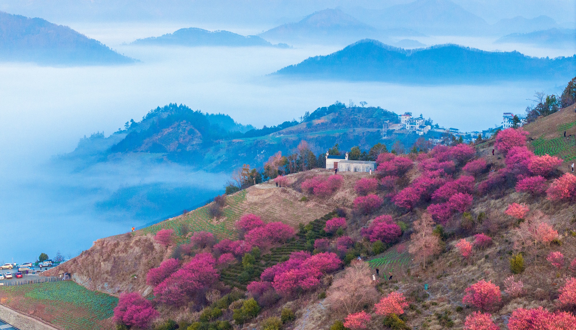 惊蛰至,春雷初鸣,唤醒蛰伏的万物。梅花在云海间热烈绽放,粉艳的花团与青黛的山峦相映成趣。薄雾如纱,轻笼着白墙黛瓦的村落,勾勒出一幅生机盎然的春日画卷。(安徽省芜湖市湾沚区纪委监委供 李明仙 摄)